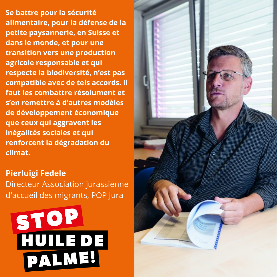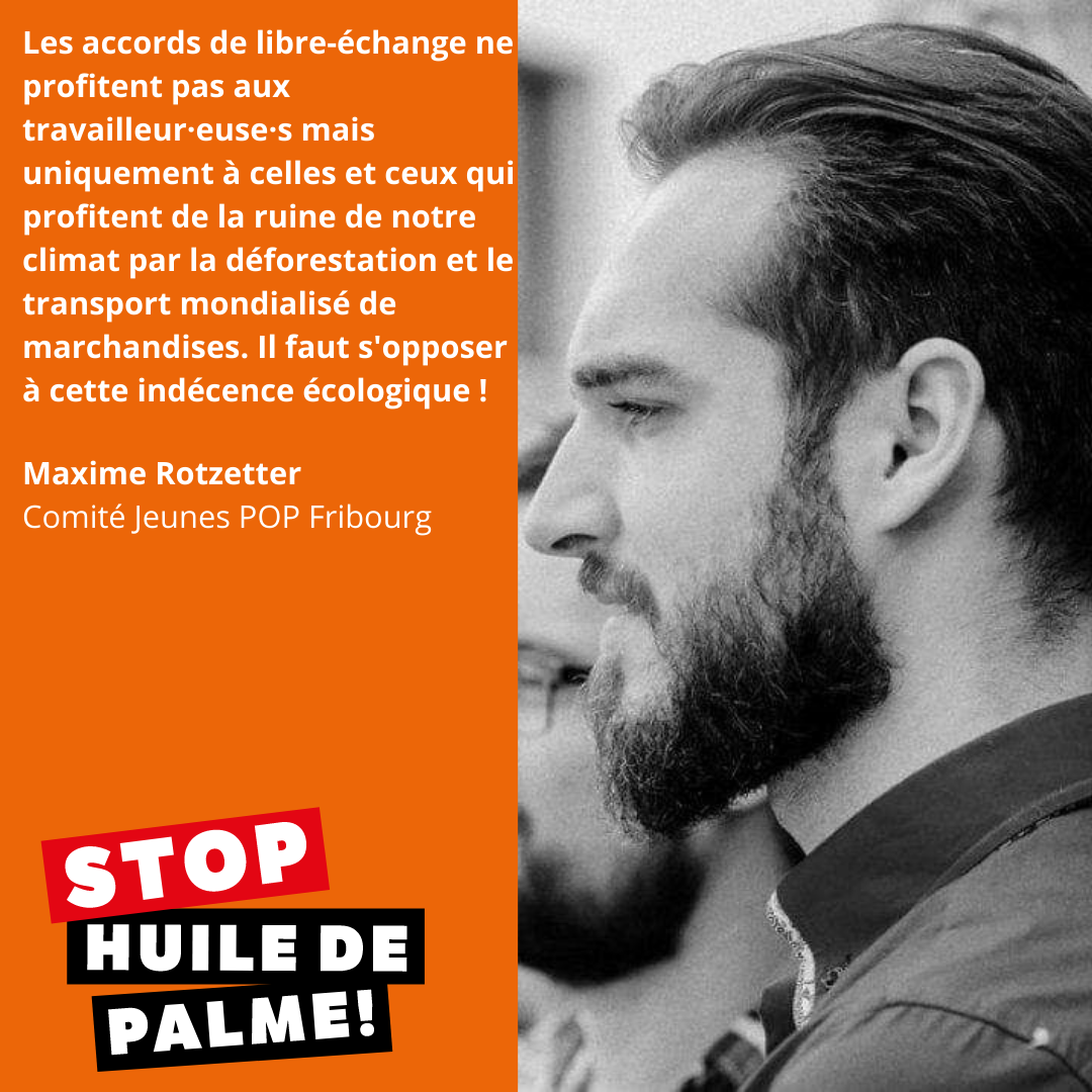 L’accord de libre-échange avec l’Indonésie ne doit pas être salué par les petits agriculteurs suisses ni par les spécialistes de la coopération au développement. C’est pourquoi le syndicat d’agriculteurs Uniterre, la JS, les Jeunes Verts, l’Association des petits exploitants et de nombreuses autres organisations ont pris le référendum contre cet accord. Le référendum a été soutenu par le PST-POP dès le début. La cause de la discorde est la production d’huile de palme par l’Indonésie. Le pays est le plus grand producteur d’huile de palme au monde. La production est étroitement liée au défrichement ou au brûlage à grande échelle des forêts vierges, qui est associé à des émissions massives de gaz à effet de serre. Bien que l’accord économique avec l’AELE stipule qu’il “n’aura pas été produit en violation des lois, politiques et pratiques destinées à protéger les forêts primaires, les tourbières et autres écosystèmes d’importance particulière de l’Indonésie, à protéger l’air et l’eau de la pollution et à garantir les droits des populations locales et, en particulier, des populations indigènes et des travailleurs agricoles”, le fait est que ce sont précisément ces clauses de durabilité qui sont exclues de l’arbitrage. Il y a également un manque de contrôle et de sanctions contraignantes. Le gouvernement indonésien lui-même a constaté dans une étude d’août 2019 que 81 % des plantations d’huile de palme violent les exigences de l’État. Les activités illégales pourraient être citées à de nombreuses reprises ici. Il est clair que ce n’est pas une façon de mener une politique de durabilité crédible. Un autre aspect de cet accord est le fait que l’Indonésie, au lieu de produire des quantités gigantesques d’huile de palme, ferait mieux de cultiver de la nourriture pour la population locale. Si l’Indonésie exportait du riz avant la libéralisation du commerce, le pays est aujourd’hui contraint d’importer environ deux millions de tonnes de riz. Plus de 20 % de la population indonésienne souffre de malnutrition. Il ne faut pas oublier que l’importation massive d’huile de palme supplante la production d’huile de colza et d’huile de tournesol.