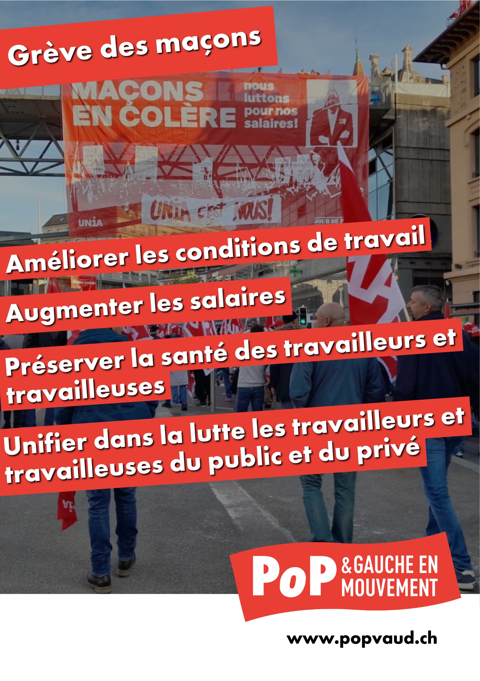 Soutien à la grève des maçons par christophegrand | Oct 31, 2025 | Lutte syndicale, Travail | 0 commentaires Le POP est solidaires avec les maçons qui ont voté deux jours de grève le 3 et 4 novembre. Nous serons avec eux dans la rue. Ci-dessous le tract du POP