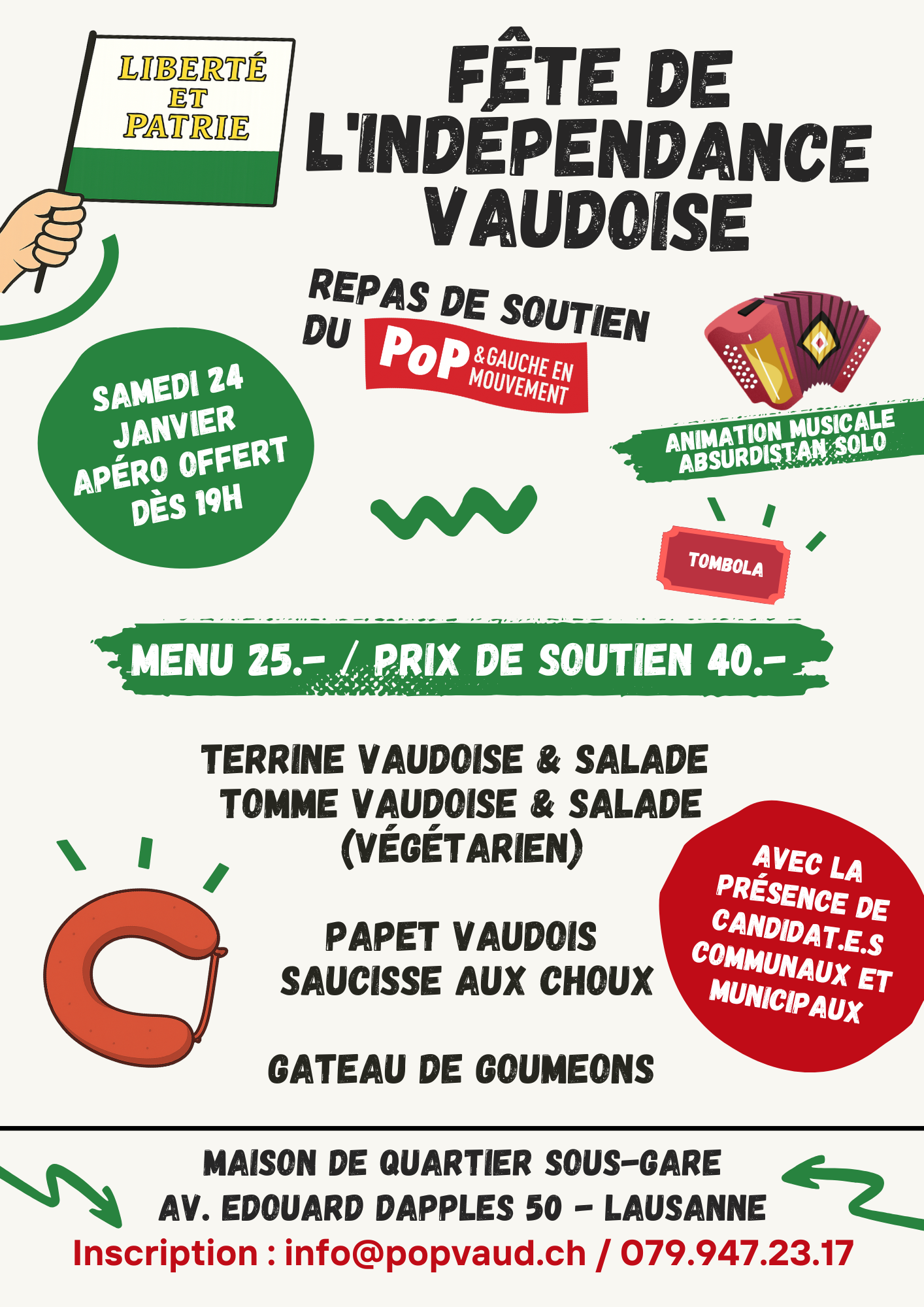 Comme chaque année, nous organisons notre traditionnel repas pour fêter l’indépendance vaudoise, cette année nous aurons aussi la présence de candidat.e.s POP dans des municipalités. C’est toujours un moment festif et de convivialité.