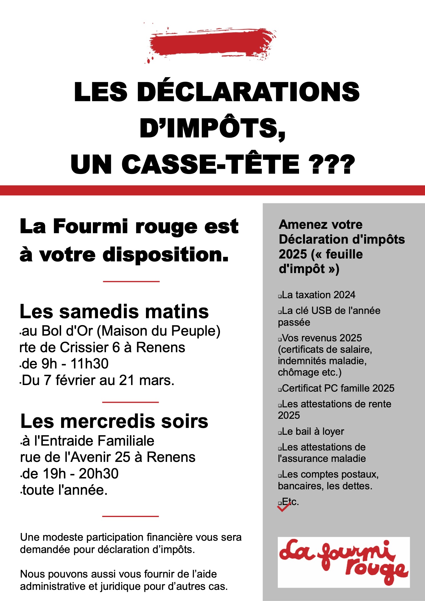 Permanences d’impôts de la Fourmi rouge à Renens by christophegrand | Fév 3, 2026 | fourmi rouge, La Fourmi Rouge, Non classé, Permanence impôts, Renens | 0 comments À Renens – Les samedis matin au Bol d’Or (Maison du Peuple), rte de Crissier 6, de 9h à 11h30, du 7 février au 21 mars. Les mercredis soirs de 19h à 20h30 toute l’année, à l’entraide familiale, rue de l’Avenir 25 à Renens.