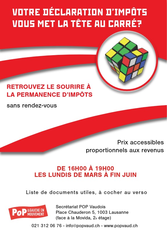 Les permanences d’impôts du POP à Lausanne : de mars à fin juin de 16h à 19h – Place Chauderon 5 – 1003 Lausanne